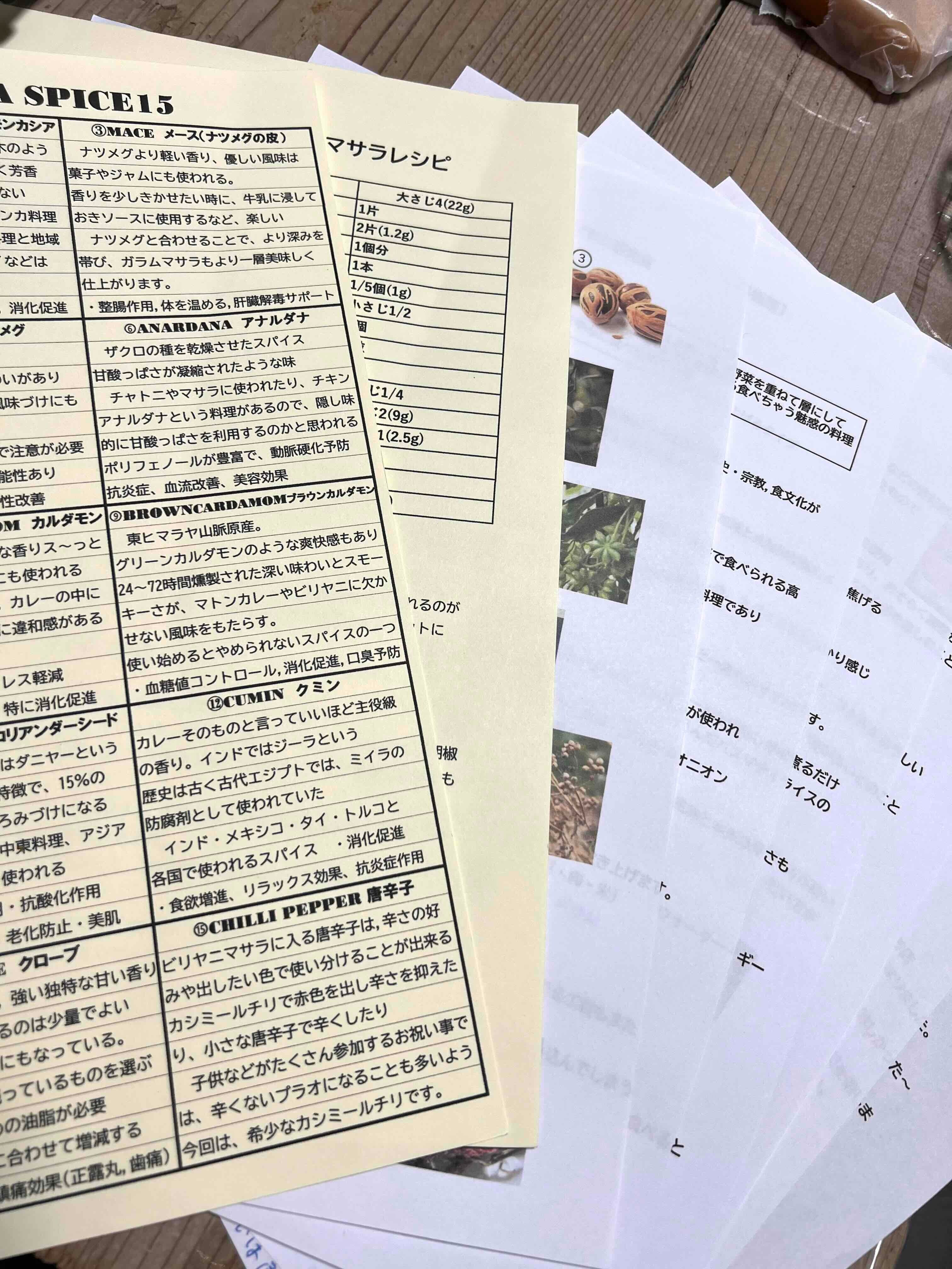 講座では、ビリヤニマサラに使われるスパイスを資料と共にひとつひとつ解説します。